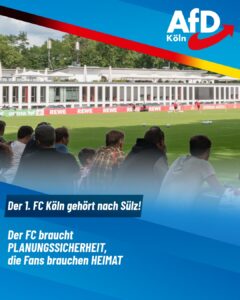 AfD Köln bekennt sich zum 1.FC Köln Ausbau des Geißbockheims wird nur mit der AfD möglich sein 21.08.2025 KÖLN: Die CDU Köln hat sich in ihrem Kommunalwahlprogramm ganz offen gegen den dringend notwendigen Ausbau des Geißbockheims ausgesprochen. Damit liegen Sie voll auf der Linie ihrer Grünen Bündnispartner. Die AfD Köln